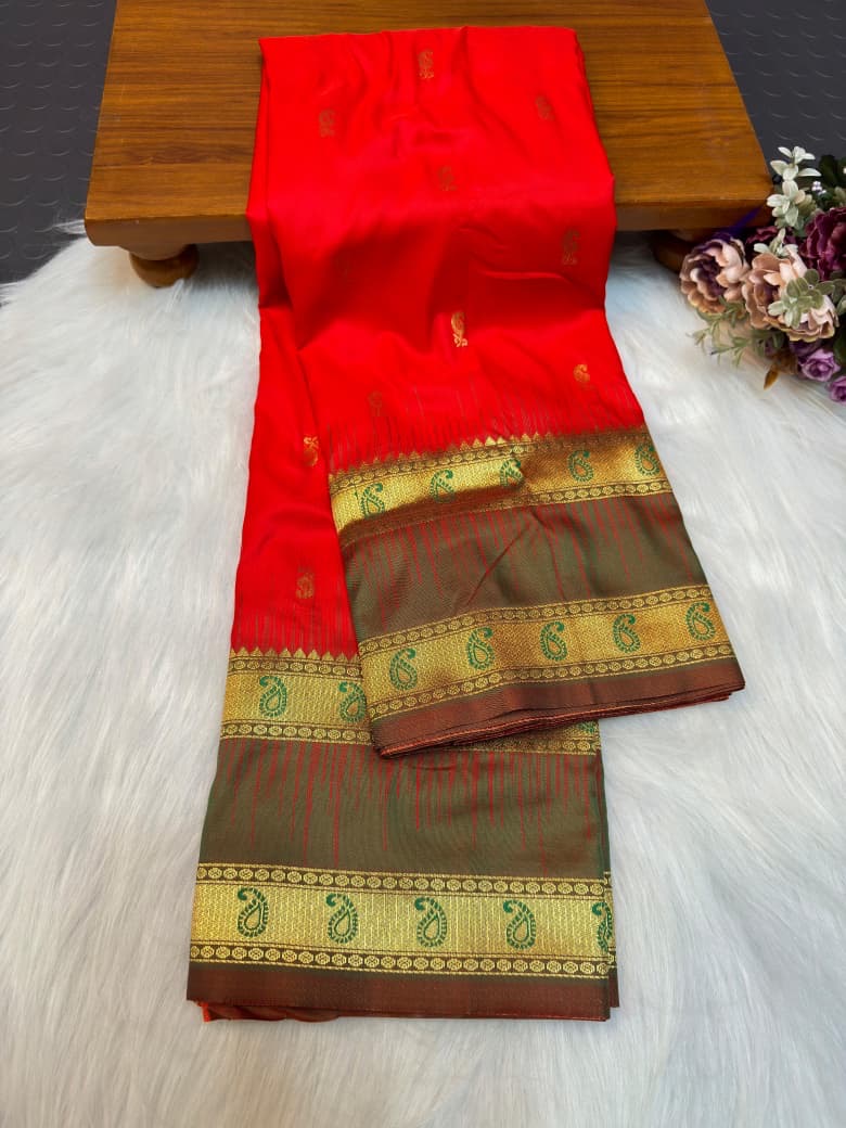 A soft silk saree with a typical South Indian Type border. Good if you like Vibrant Colours and Border.